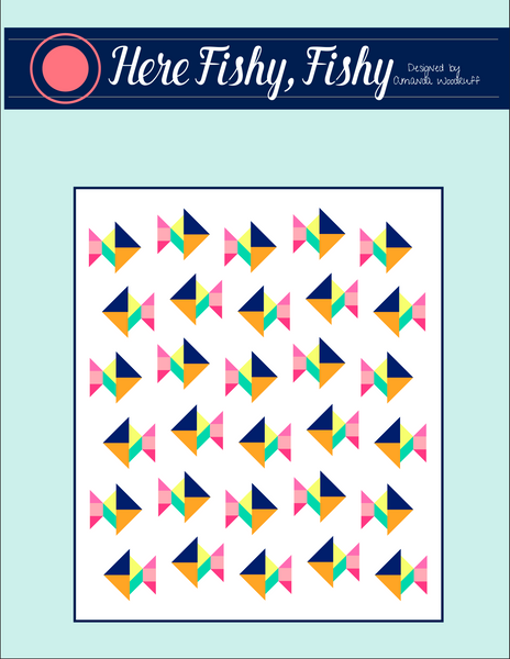 Here Fishy Fishy is a patchwork fish pattern from (10) 1/4 yard pieces & 3-1/2 yards of white creating a finished quilt that measures.