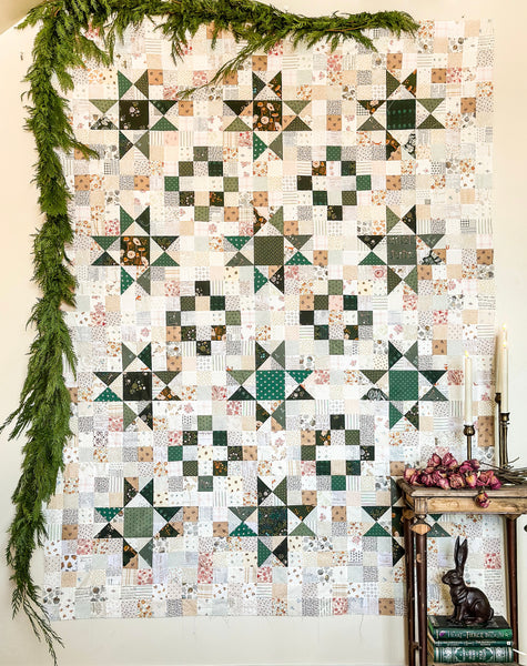 This Quilt Kit comes with 22 fat quarters of low volume and 10 fat quarters of pine-colored fabric and a full-color illustrated paper pattern. Fabrics will be similar but will include different prints from the pictured quilt (see bundle picture for prints). This kit includes everything you need to make the scrappy, patchwork top for this beautiful foresty-colored twin quilt.