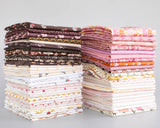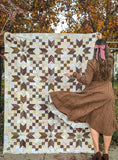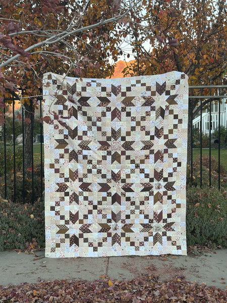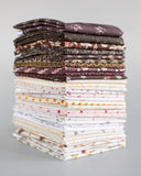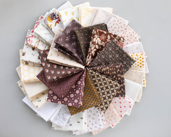 This Quilt Kit comes with 24 fat quarters of low volume and 10 fat quarters of chocolate-colored fabric and a full-color illustrated paper pattern. Fabrics will be similar but will include different prints from the pictured quilt (see bundle picture for prints). This kit includes everything you need to make the scrappy, patchwork top for this beautiful cinnamon-colored twin quilt.