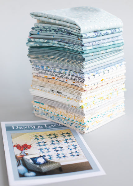 This Quilt Kit comes with 24 fat quarters of low volume and 12 fat quarters of dusty blue -colored fabric and a full-color illustrated paper pattern. Fabrics match exactly the bundled pictures and will be very similar to the pictured quilt. This kit includes everything you need to make the scrappy, patchwork top for this beautiful blue star quilt.