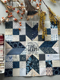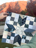 PRESALE: This Quilt Kit comes with 24 fat quarters of low volume and 10 fat quarters of navy-colored fabric and a full-color illustrated paper pattern. Fabrics will be similar but will include different prints from the pictured quilt (see bundle picture for prints). This kit includes everything you need to make the scrappy, patchwork top for this beautiful cinnamon-colored twin quilt.